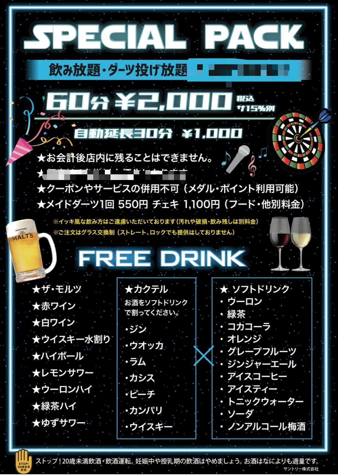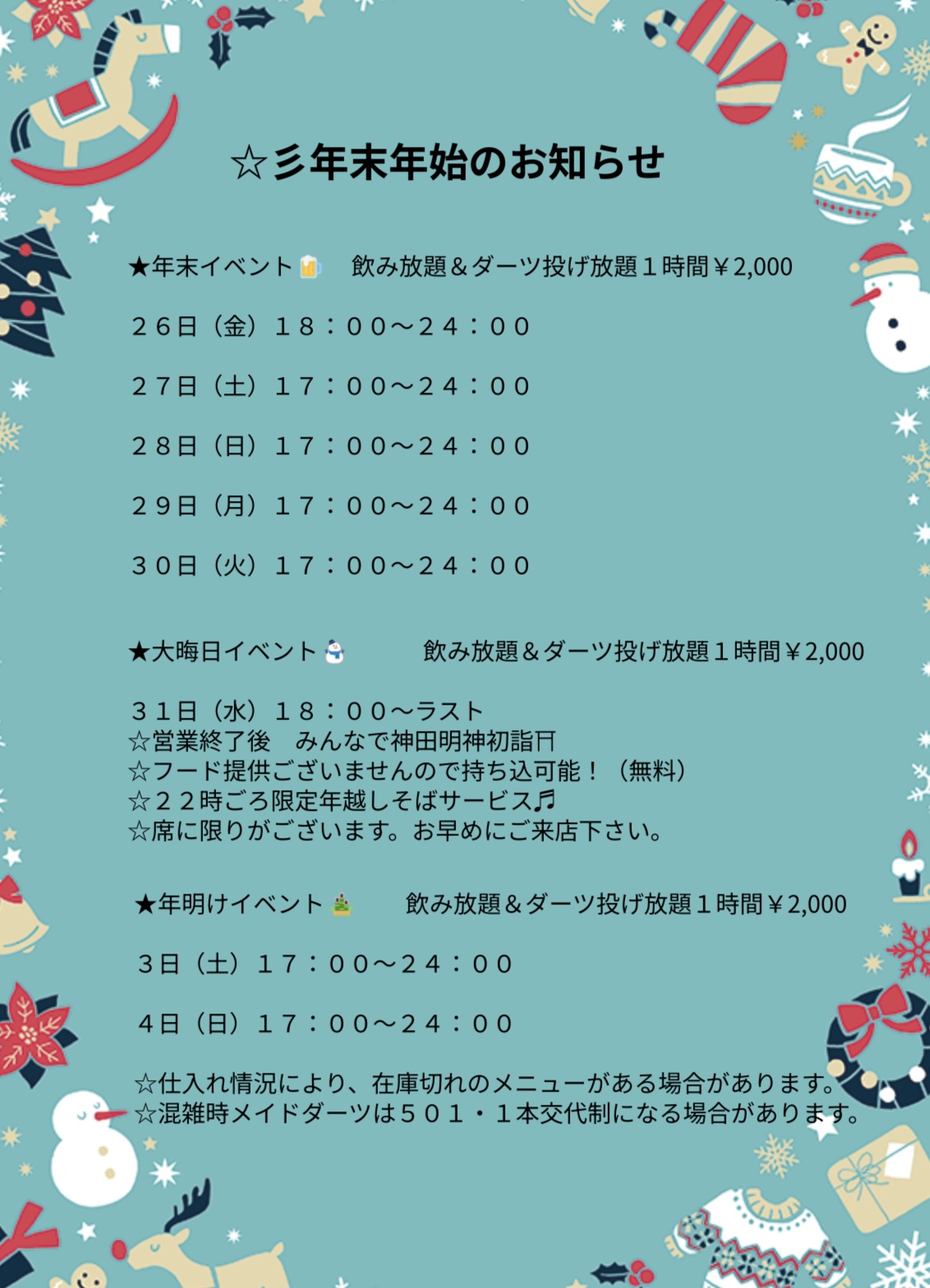 ・年末年始お知らせ 元旦・2日店休 (26日〜4日飲み放題ダーツ投げ放題)